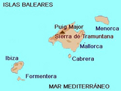 • Las islas Baleares se encuentran al este de España, en el mar Mediterráneo. Están formadas por cinco islas: Mallorca, Menorca, Ibiza, Formentera y Cabrera. • El relieve de las islas Baleares es poco montañoso. Destaca la sierra de Tramuntana en el norte de Mallorca, donde se encuentra el pico Puig Major, máxima altura de las islas.