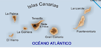 • Las islas Canarias se encuentran al oeste de África, en el océano Atlántico. Son siete islas: Lanzarote, Fuerteventura, Gran Canaria, Tenerife, La Gomera, El Hierro y La Palma. • El relieve de las islas Canarias es montañoso de origen volcánico. En la isla de Tenerife se encuentra el pico Teide, el más alto de España.