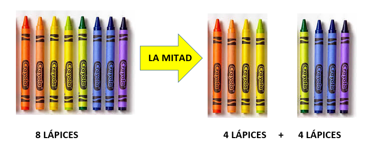 Por ejemplo, si tenemos 8 lápices y queremos calcular la mitad, hacemos dos grupos con los lápices y en cada grupo tenemos que tener 4. Así vemos que la mitad de 8 es 4.