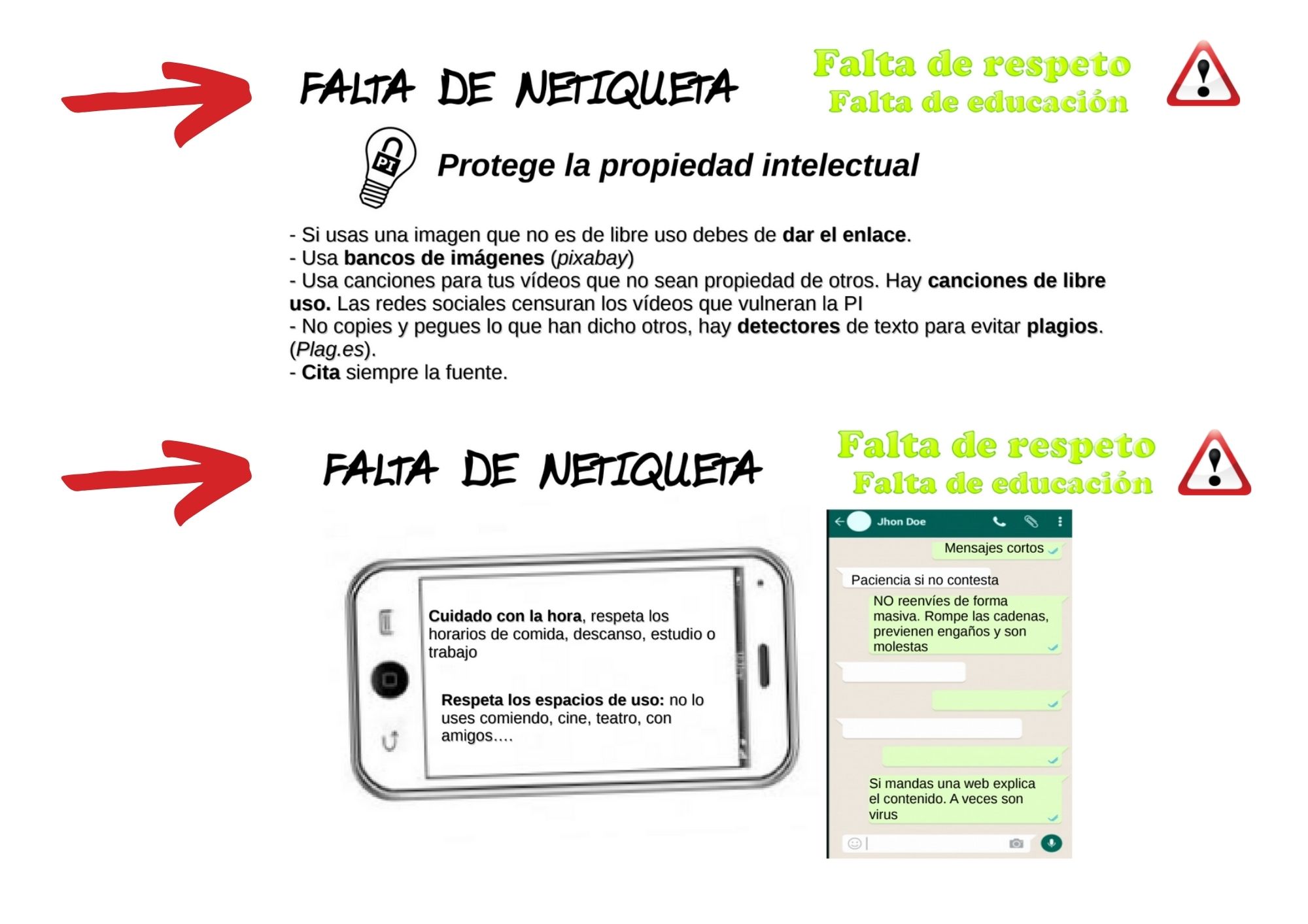 - Si participas en redes sociales, evita siempre los comentarios que no sean respetuosos con los demás. Recuerda que no debes etiquetar ni fotos ni comentarios de personas sin tener el permiso para ello. No compartas información sin el permiso de la persona que la ha creado ni hagas tuyo material que han creado otras personas. Ten muy en cuenta el uso de licencias para compartir material en RRSS.