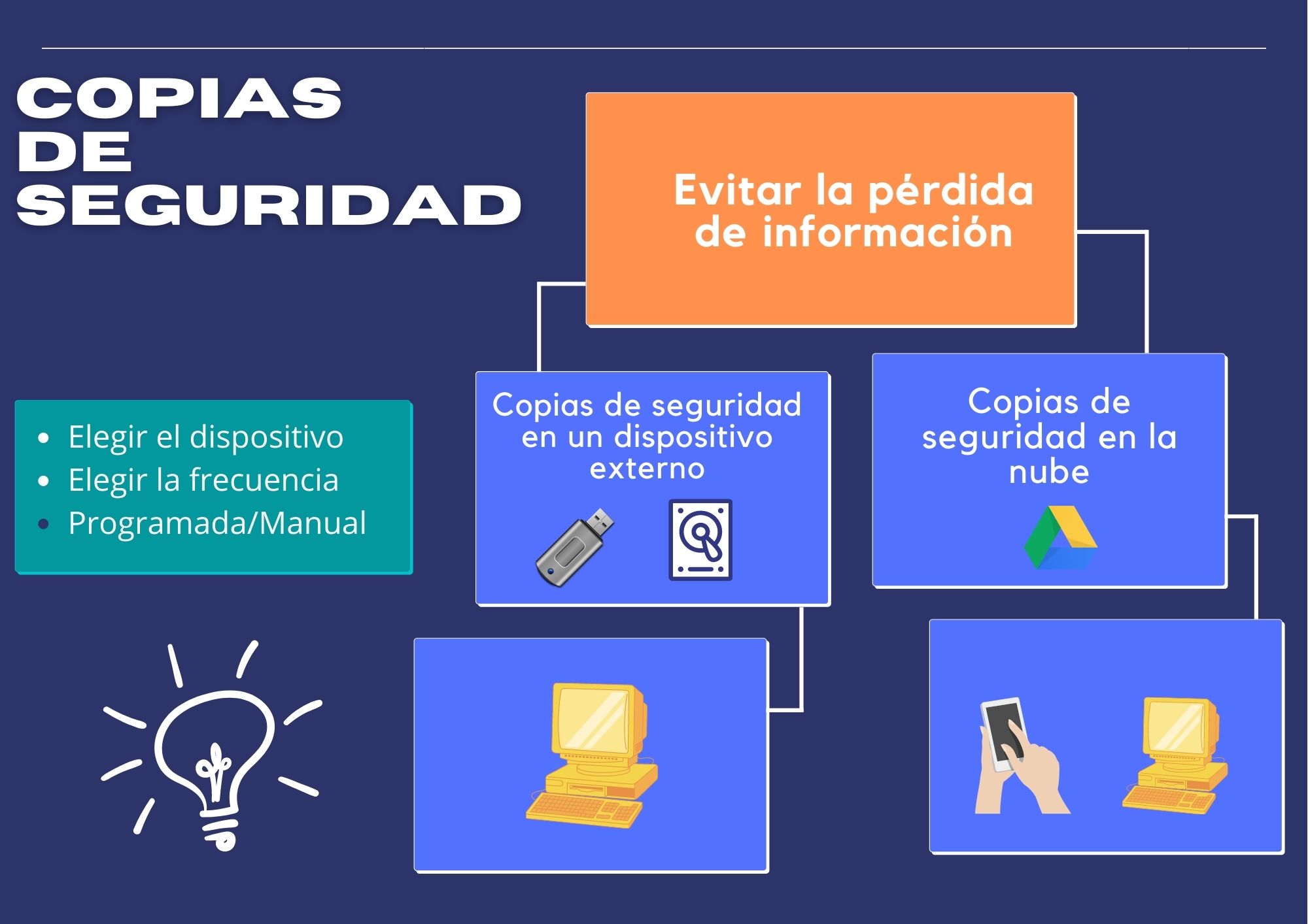Para evitar la pérdida de información de tu dispositivo es conveniente que realices copias de seguridad cada cierto tiempo. Estas copias de seguridad se pueden programar o se pueden realizar de forma manual pero no olvides que se deben de realizar en dispositivos externos (discos duros o la nube).